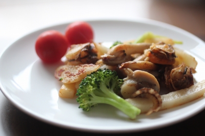 ① きのこは、汚い部分を切り捨てて、大きめに切るか、さいておく きのこは洗うと味が抜けるので、私はあえて洗わない(火を通すのでOK) ホタテは、大きければ2つに切る(上の写真は小さいので切ってない) じゃが芋を使うのなら、拍子木切りにして水洗いしてから、ざるにあげる ピーマンは、細切り(万能ねぎは細かく切り、ねぎは斜め切り) ② フライパンにバターを溶かし(じゃが芋を使うのなら最初に炒めること) きのことホタテを菜箸でかき混ぜながら、こんがり炒める ③ こんがりしたら、ピーマン(ねぎの斜め切りでも)を入れてざっと炒めて、 火が通ったら、鍋肌から醤油をジュッと入れてからめるようにして火を止める ④ お皿に盛りつけて、(万能ねぎやねぎ、ゆでたブロッコリーなどをのせて) コショウをふって食べる |