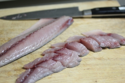 | 2人分材料 ●サバ 1尾 魚屋さんで3枚におろしてパック されてあるものを使用 正味240gとして ●生姜 多めの方が美味しい ●あれば青み 写真ではゆでたスナップえんどう を添えました 〇砂糖・酒・醤油 |