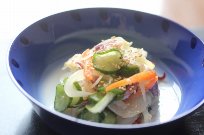 ① 玉ねぎはうす切り、人参は細いせん切りにしてお皿に広げ、水をパッパッと 手でかけて水分を与えてから、電子レンジでチンする ※ゆでたり、冷水にさらしたりするよりも、甘みが出るのが電子レンジを使う方法 大根を使うのなら、皮をむいてから短冊に切り、味塩少々をふって30分間置き、 水気が出たら、絞る ② きゅうりは、うすい輪切りにして、味塩少々をふり、30分くらい水気が出て しんなりするまで置いておく しんなりしたら、手でもんでから絞る ③ さめた玉ねぎ、人参ときゅうりを中ボールに入れ、酢味噌で和える(味見する) 酢味噌ー砂糖大さじ1、味噌大さじ1、酢大さじ1(お好みで) 和えずにあとで食卓で各自がかけてもよい(上の写真) ④ 冷蔵庫で冷たく冷やしてから、盛りつける(白ごまをふって) |