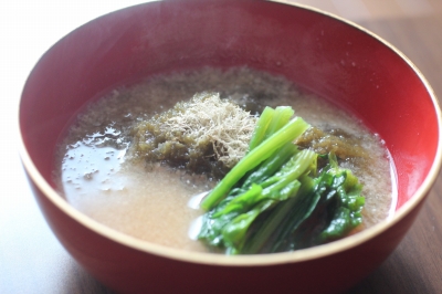 ① 具なしの味噌汁を作る 小鍋に水を600cc入れて、沸騰したら火を止めてから、だし入り味噌を入れる この場合、とろろ昆布に塩気があるので、少し薄めに味つけする ② その間に、ねぎやみょうがを切る ③ 食事前に鍋を温め、お椀にとろろ昆布を好きなだけ入れ、 ねぎやほうれん草、みょうがなどをのせ、熱い味噌汁を注ぐ ④ 好みで一味唐辛子などをふる |