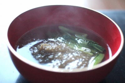 ① 鍋に水600ccを入れて火にかける ② 沸騰したら、だしの素小さじ1、醤油大さじ1弱(お好みで)を入れて、 味を見てちょうどよければふたをして火を止める 昆布を入れるので、いつもより味はうすめにすること また梅干を使うのなら、塩分があるので、醤油は少し減らすこと ③ お椀にとろろ昆布を入れる ねぎは、小口切りにして、お椀に入れる 梅干を入れるのなら、手でちぎってお椀に入れる ④ 鍋を温めて、沸騰直前に火を止めて、熱い汁をお椀に盛る ※何もなくても、とろろ昆布さえあればできるお手軽なおすまし。 しつこいおかずなどに添えて。 |