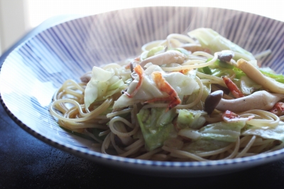 | ① 大鍋にお湯を1500cc以上わかしておく(大鍋に半分以上) ② その間に具の用意をする キャベツは、洗って大きめに切って水気を切っておく (芯もうすく切って使ったらいい) きのこは、汚い部分を切り捨て、大きめに切っておく ピーマンを使うのなら、せん切りにしておく ③ ①のお湯が沸騰したら、塩小さじ2を入れてから、スパゲティーをゆでる スパゲティーの袋に書いてあるゆで時間よりも1分間短くゆでること 時々、かき混ぜてひっつかないようにゆでる ④ 隣りのガス台で具を炒める フライパンに油少々とバターを温め、きのこ、キャベツ、ピーマン、 桜海老の順に炒めて、味塩で味をつける ⑤ スパゲティ―がゆで上がったら、ざるに上げて、さっと水気を切って (ゆで汁も少し入れたいのでしっかり水気を切らなくてもいい)) すぐに大鍋に戻して、④の具を混ぜ合わせ あとは適当にバター・めんつゆ・醤油などを味を見ながら入れ味を調える ⑥ お皿に盛りつけて、各自でコショウやタバスコをかけて食べる |