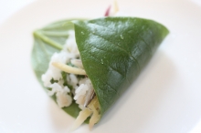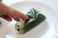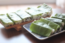 | 2人分材料 ●ご飯 350~400g(お好みで) ご飯の量はおかずによって決める 約米1合半(お好みで) ●新鮮な魚 正味120g以上 (刺身にできるくらい新鮮なもの) タイ・アジ・イワシなど 福井の小鯛の笹漬け(酢じめ鯛)や しめサバ70gを使えばすぐできて便利 ●みょうが 大なら1個(小2個)なくてもよい ●生姜 お好みの量 ●青じそ 10枚 〇すしの粉(粉状)タマノイすしのこ使用 〇味塩・酢(魚の調理用) 〇すし酢(液体、みょうがと生姜を漬ける) ![]() お庭の大きな柿の葉で包んで 押し寿司にしても季節感があります |