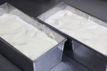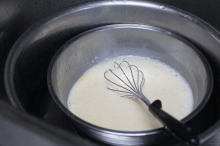 | ① 小ボールに水を80cc入れてから、粉ゼラチンをふり入れてかき混ぜておく ② 缶詰の果物を使うのなら、コロコロに切ってざるにあげて水気を切っておく (いちごなら、洗ってへたを取り、大きいものは少し小さく切っておく) ③ 中鍋で牛乳300ccを中火で温める (均一に温まるように時々スプーンでかき混ぜること) ④ 中ボールに卵2個を割り入れて、カラザを取り除き、砂糖65gを加えて 手動泡だて器でよくかき混ぜる ⑤ ③の牛乳が熱くなったら(鍋のふちが少し泡立ってきたら)火を止めてから、 ①のゼラチンを入れて、完全に溶かす ⑥ ④の卵のボールに、④の熱い牛乳を一気に入れて混ぜ合わせて、 卵牛乳のボールを水の入ったボールに浮かせて周りから冷やす (時々、水を替えること) ⑥⑦を同時に⑦ 生クリームは、きれいな乾いた中ボールに入れて、ハンドミキサーで とろりとするまで泡立てる(ケーキの生クリームのようにかたくしたら×) ⑧ ⑥の卵牛乳のボールを今度は氷水に浮かせて一気に冷やしてとろみをつける ⑨ 少しとろっとしてきたら、生クリームを加え混ぜる(味見) とろっとした状態で果物を入れないと底にたまるから ⑩ 急いで、型に流し入れ、果物をなるべく均等に埋め込み、冷蔵庫で冷やす → ![]() 全部、型に入りきらなければ、プリンカップなどに余りを入れて固める ⑪ 熱いお湯に型をつけて、周りをゆるませてから、お皿をかぶせてひっくり返す ⑫ 切り分けて、緑の葉っぱなどで飾る |