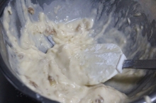 | 2人分材料(何回分もある) ●バナナ(よく熟したもの)約300g 皮をむいた状態で300g (2〜3本 大きさによる) ●インスタントコーヒー 大さじ1 ●牛乳 大さじ1 ●バター 80g ●卵 1個 ●強力粉 200g ●ベーキングパウダー 小さじ1弱 〇砂糖 100g(お好みで) 〇塩 少々(親指と人差し指でつまむ) 〇クッキングシート 〇パウンドケーキ型 1つ |