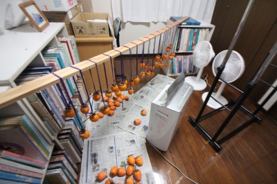 | 2人分材料(冷凍保存できる) ●渋柿 何個でも お庭に渋柿の木があればぜひ! うちは2025年には100個以上収穫 〇荷造りひも 〇洗濯のさおなど うちの場合、ゴロゴロの洗濯干しと 家にたまたまあった平たい板使用 〇除湿器(洗濯用) 3〜4日おきの洗濯の日には 日中、柿は干さずに洗濯物を乾燥 その場合、夜中、柿に除湿器を使用 |