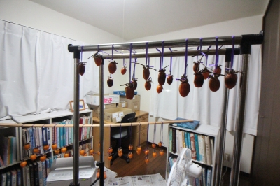 ① 11月の終わり頃、オレンジ色になったものから庭の柿を 枝を残して(枝がないとひもで吊るせないので注意)庭はさみで柿を収穫して 家の中の新聞紙を敷いた上に、とりあえず置く (もう少し濃いオレンジ色になるまで放置するということ) ② 濃いオレンジ色になった柿から順に干し柿にしていく さっとお水で洗い(ほこりを取るため)、ざるに入れて乾かしておく 自然乾燥がめんどくさければ、タオルなどで水気をふき取る ③ 荷造りひもを1組について80cmくらい切って準備する 例えば柿が20個あったら、80cm×ひも10本必要になる ④ 柿の枝にひもを通し、しっかりとから結びする(落ちたら最低なのでしっかり) なるべく大きさの同じくらいの2個をペア―にするといい ![]() ⑤ 全部ひもで結んだら、包丁でへたの反対側から縦に皮をむいていく 途中で1〜2個、ポロンとへたが取れてしまう柿があったら 皮をむいて一口大に切り、お皿に並べて冷蔵庫で干し柿にするといい (左下写真の四角いお皿) ![]() ⑥ 柿をひっつけないようにして、吊るし、部屋を密封して除湿器の風をあてる 扇風機もあれば併用する ※除湿器は水がたまったら、機械が止まるので、水を捨ててから またスイッチON 夜中は危ないので、ドアを閉めて、除湿器は切っておくこと 右上のゴロゴロに干してある柿は左上写真の柿よりも、 早く干したので、もうすぐ食べられる ⑦ 表面が乾いてきたら、時々、やさしくモミモミすると、渋が早く抜ける ⑧ 大きさにもよるけど、1週間くらいで少し黒くなり、中は軟らかく甘くなる もっと硬く、普通の干し柿みたいにしたければ、もっと干すといい ⑨ 干しあがったらお皿に入れ、ラップしないで冷蔵庫に保存する もっとたくさんあったら、1つずつラップして冷凍すれば長期間保存できる ※除湿器を使えば、めんどうな熱湯消毒や焼酎消毒も必要なしで、外に干さないので 天気にも左右されないし、鳥に食べられる心配もありません。 |