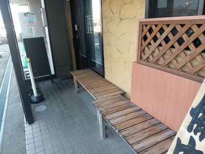 ![]() 木のベンチが3つ置いてあるので 詰めれば9人座れます。 お店に近い所から順番に座っていきます。 |