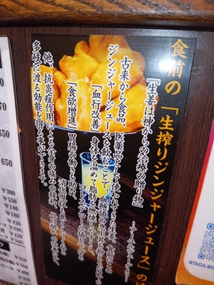 ![]() 「食前の生搾りジンジャージュース 生姜は神からの贈り物 古来から食品、医薬品として使われてきた生姜。 ジンジャージュースを食前に飲むことで 血糖値の急上昇を抑えられます」……と 書いてありますが、そうでしょうか? かなり甘いジュースなので、血糖値うんぬんは 逆効果のような気がしますが。 でも確かに食欲が出るし、多分消化吸収を よくしてくれます。 生姜パワーです。 |