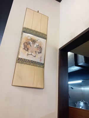 ![]() カウンター横の掛け軸を見て笑いました。 大河(たいが)と虎(タイガー)をかけて 虎の絵の掛け軸を掛けてあるんです。 |