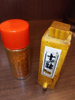 ![]() これがうわさの名物「十味唐辛子」です。 普通の七味唐辛子にえごま、紫蘇の葉や種など 3種の薬味を追加したものです。 面白い。 体にいい薬味ですね。 ![]() |