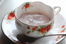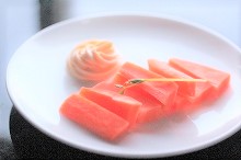 ![]() 3週間くらい前に友人から珍しいカリンという果物をもらいました。そのままでは渋くてすっぱくて食べられないので砂糖で煮てコンポートにしてあったものを使いました。歌にも歌われているカリンを生まれて初めて見ました。 |