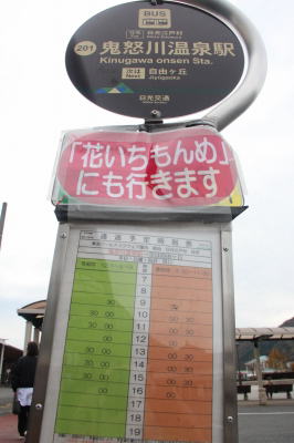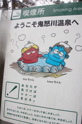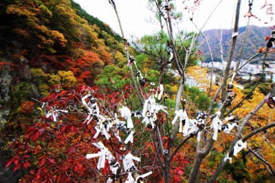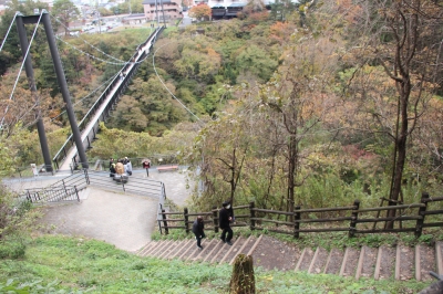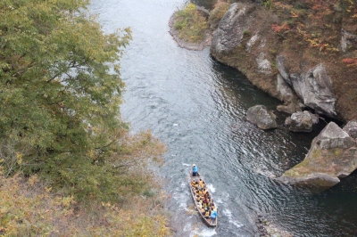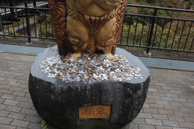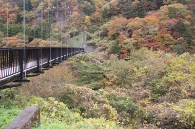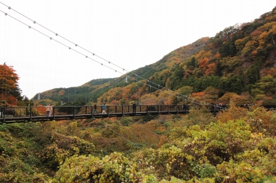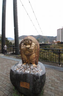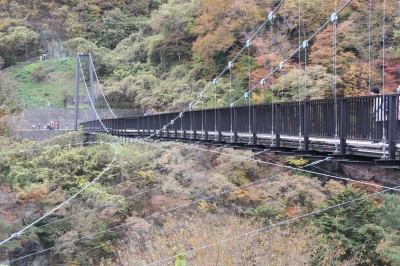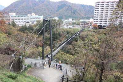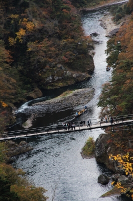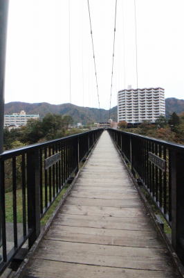 | 午前中にスーツケースを預けて、歩いて近くの鬼怒楯岩大吊橋に散歩に行きました。 ![]() 10:30にホテルおおるり出発。 ![]() ![]() ![]() 鬼怒楯岩大吊橋(きぬたていわおおつりばし)に到着。 鬼怒川温泉街の南部と「楯岩」を結ぶ全長140mの歩行者専用吊橋です。 着いた途端、橋の上の人たちが下に向かって手を振っているのが見えました。 「あーーーライン下りの舟が通る!!!」と気づき、橋の真ん中まで走りました。 ばばあが走ったら、橋がグラグラと相当揺れたかも。 まるで鴨が二羽泳いでいるかのようです。 船頭さんが頭の部分になっています。 ![]() ![]() ![]() 橋を渡ったら、鬼怒川温泉のキャラクターの鬼怒太くんの像があって ミニ楯岩の上がお賽銭置きになっていました。 オープン賽銭箱なのでやはり100円玉はなく、1円・5円・10円でした。 ![]() 橋はすき間のない板張りなんですが、時々、穴(節穴)が開いていて 下の河原の石が見えるのにびっくりしました。 まさか板1枚とは………。 |